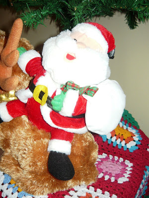 Terminei de fazer a toalha colorida de quadrinhos e terminei em boa hora porque tive que tirar o tapete,que eu tinha colocado em baixo da árvore,nosso cachorrinho(totozinho) sapequinha estava destruindo a árvore de natal,então agora coloquei a árvore em cima de uma mesinha e a toalha coloquei na mesinha,e coloquei mais enfeites na árvore agora ela esta completinha do jeito que eu queria, hoje dei um saidinha e não resistir e comprei mais coisinhas de natal ai ai ...meu cartão vai estourar rsrs(brincadeira)sou controlada, até demais.